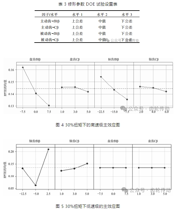 借助試驗設計(Design Of Experiment, DOE)的方法,以齒輪修形參數為因子,以公差偏差及中值為水平,以傳遞誤差為響應值,進行修形參數的全因子設計如表 3 所示,并通過效應分析,可以得到每種修形在不同工況下的效應圖,如圖 4 和圖 5 所示。可以看出圖 4 中,高速級對修形參數的變化比較敏感,圖 5 中低速級對修形參數的變化相對不敏感。通過這種方法,可以確認設計值的中值以及公差帶范圍,并且針對將來可能出現不同扭矩下的階次噪音問題,已經獲得了零件的修形傾向,極大地增強了設計的魯棒性。