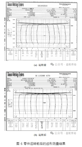 通過耐久試驗后,使用齒輪測量機對齒輪進行檢測,觀察齒形齒向上的嚙合情況,測量結果如圖 6 所示。可看出未出現由于偏載帶來的嚙合凹陷,齒面接觸狀態良好,齒面狀態與新件接近。