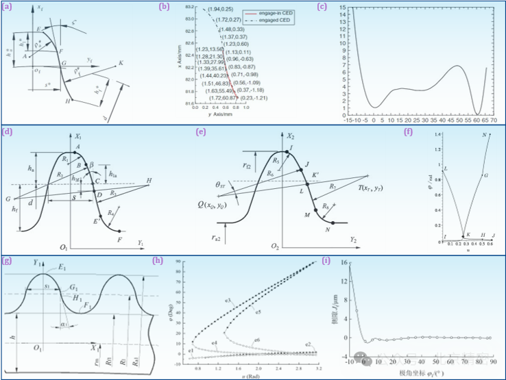 圖6 雙圓弧、三圓弧及擺線齒廓設計:(a) 公切線型雙圓弧齒廓; (b) 雙圓弧齒廓的二次共軛設計; (c) 雙圓弧齒廓的嚙合側隙; (d) 三圓弧柔輪齒廓; (e) 三圓弧剛輪齒廓; (f) 三圓弧齒廓的共軛范圍; (g) 變系數擺線齒廓; (h) 變系數擺線齒廓的共軛范圍及多次共軛; (i) 變系數擺線齒廓的嚙合側隙.