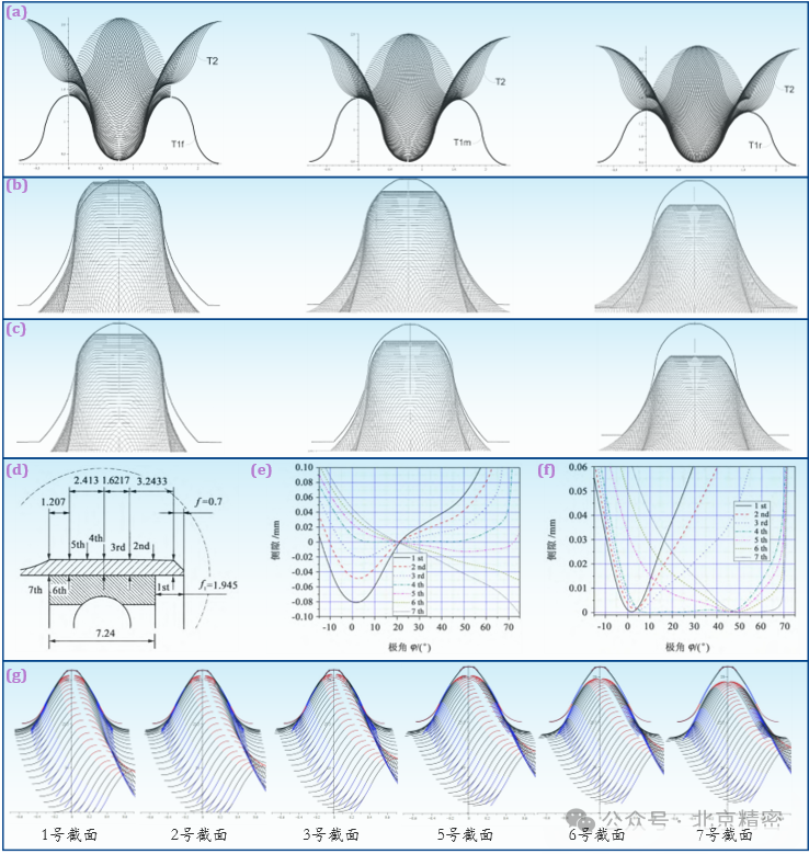 (3) 近似共軛的徑向變為修形三維齒形對柔輪齒形沿軸向做連續徑向變為修形也可以有效避免嚙合干涉。課題組以三圓弧齒廓為例進行了多截面連續徑向變為修形齒形的設計研究(圖7d),在修形前,除齒廓設計截面外,其余截面上都出現了不同程度的嚙合干涉(圖7e),修形后消除了嚙合干涉現象(圖7f)。同時,在徑向變為修形后,各個截面上柔輪與剛輪的嚙合齒對都處于近似共軛的嚙合狀態(圖7g)。徑向變位修形的齒形方案加工工藝成熟方便,是工程中應用最廣泛的方案。