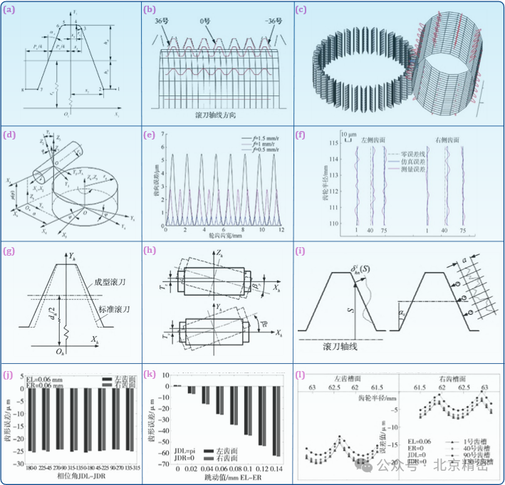 圖8 滾齒加工誤差分析:(a) 滾刀軸向齒形; (b) 滾齒仿真截面示意圖; (c) 加工仿真; (d) 滾刀空間運動關系; (e) 不同軸向進給量下的齒向誤差; (f) 左右側齒面的齒向誤差; (g) 成型滾刀軸向齒形; (h) 滾刀安裝誤差示意圖; (i) 滾刀切削刃齒形誤差示意圖; (j) 滾刀跳動相位角對齒形誤差的影響; (k) 滾刀跳動值對齒形誤差的影響; (l) 滾刀安裝誤差引起的齒形誤差.