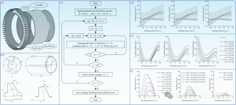 諧波齒輪有多達40%以上的齒對處于嚙合狀態,多齒對間嚙合力求解是高度非線性接觸問題。為揭示柔輪結構對其嚙合點周向剛度的影響規律,課題組提出柔輪嚙合點周向剛度的理論計算方法。將周向力引起的柔輪嚙合點變形拆分為筒體變形和齒體變形,推導周向力作用下柔輪杯底、光筒、齒圈和圓弧過渡部分的扭轉變形及輪齒的彎曲和齒根轉動的理論公式,并基于周向位移等效折算柔輪嚙合點周向剛度(圖9a、b)。提出空間嚙合齒面間的負載側隙和嚙合力的理論迭代算法(圖9c)。基于負載工況下柔輪的周向剛度矩陣和真實齒廓參數計算空載齒間側隙分布,迭代計算負載側隙和嚙合力分布(圖9d-f)。