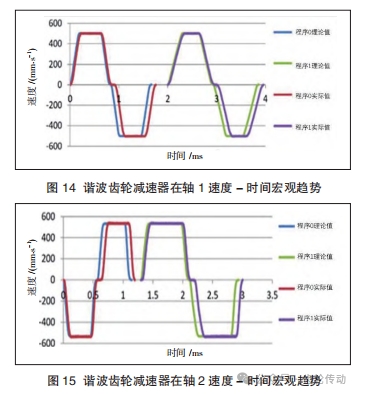 圖 14 是減速器 1 在軸 1 上的速度曲線圖。在程序 0 中,藍色線表示理論速度值,而紅色線表示實際速度值。另外,在程序 1 中,綠色線表示理論速度值,而紫色線表示實際速度值。