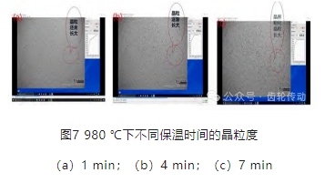 加熱溫度980 ℃下晶粒度變化:考慮不同的微觀組織和析出相對晶粒長大的釘扎作用,繼續提升滲碳溫度觀察晶粒長大情況,將模擬滲碳的溫度調至980 ℃,同樣的加熱方式分別截取保溫 1 min,4 min 和 7 min 時試樣的實時晶粒度照片如圖7。