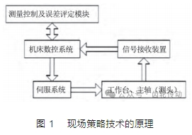 在機測量技術使用時,測頭的位置朝向機床位置移動,在移動過程中所加工的產品會與測頭接觸,在等到一段時間后,測頭內部的觸點便會出現脫開的情況。這時測頭借助無線電通過接收器的傳播,將所獲取的信號發送到機床,機床在收到指令后,會在第一時間內停止運行、跳轉運行、保持運行等。并且,機床中還會將所記錄的一些坐標值、坐標系、相關數據等傳送到系統中,系統進行保存和管理。其中在傳輸過程中,程序會通過所增設的 RS232 串口進行數據的識別、傳輸等,進而結合程序中提到的要求,對所加工的產品進行測量。RS232 串口起到了輔助的功效,可在完成數控系統的任務中將坐標的數據進行傳輸,測量軟件中獲取相應數據。這些數據再根據該軟件中的分類儲量點以及計算誤差補償,詳細記錄用戶所需要的結果報告,進而為后續工作提供指導和參考。以下針對在線測量技術進行了分析(如圖 1)。