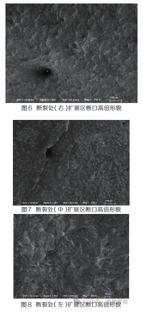 掃描電鏡觀察斷裂金屬輪齒的斷口形貌發(fā)現(xiàn),斷裂起始于輪齒的工作面?zhèn)龋言磪^(qū)的斷口形貌呈疲勞輝紋特征(見圖 3、圖 4、圖 5),裂紋擴(kuò)展區(qū)的斷口形貌呈疲勞輝紋特征(見圖 6、圖 7、圖 8)。