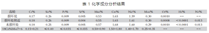 對(duì)金屬齒輪進(jìn)行化學(xué)成分分析,結(jié)果發(fā)現(xiàn)齒輪的成分符合 EN10084-1998 中 18CrNiMo7-6 的成分標(biāo)準(zhǔn),結(jié)果見表 1。