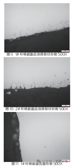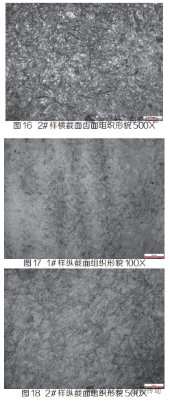分別在 1# 輪齒的未損壞區(qū)域取橫截面和縱截面、在 2# 輪齒對(duì)應(yīng)于 1# 輪齒的損壞區(qū)域取橫截面和縱截面進(jìn)行金相檢驗(yàn),結(jié)果發(fā)現(xiàn)金屬齒頂和齒根部位均存在微裂紋,齒面基本無微裂紋,但在 2# 輪齒的齒面上存在損傷凹坑;輪齒表面經(jīng)過滲碳淬回火處理,滲碳層的金相組織為針狀馬氏體、貝氏體及殘余奧氏體,輪齒心部的金相組織為回火馬氏體 + 貝氏體,組織中存在帶狀偏析(見圖 9~18)。