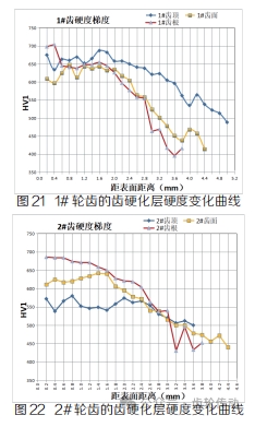 分別在 1# 輪齒的未損壞區(qū)域取橫截面、在 2# 輪齒對(duì)應(yīng)于 1# 輪齒的損壞區(qū)域取橫截面,對(duì)齒頂、齒面、齒根進(jìn)行有效硬化層深度的測(cè)定:1# 齒頂有效硬化層深度約為 4.2mm,2# 齒頂有效硬化層深度約為 2.6mm,1# 齒面有效硬化層深度約為 2.8mm,2# 齒面有效硬化層深度約為 2.4mm,1# 齒根有效硬化層深度約為 2.8mm,2# 齒根有效硬化層深度約為 2.6mm,1# 輪和 2# 輪齒的齒硬化層硬度變化曲線見圖 21、22。