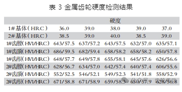 分別在1#輪齒(斷裂齒)和2#(完整齒)輪齒的橫截面上對(duì)基體進(jìn)行硬度檢測(cè),1#輪齒的基體硬度為36.0~39.0HRC,表面硬度為56.6~59.5HRC,2#輪齒的基體硬度為38.5~40.0HRC,表面硬度為51.8~58.9HRC,結(jié)果見表3。