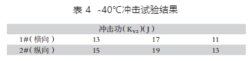 在金屬齒軸半徑的 1/3 位置取 1 組橫向沖擊試樣,齒軸半徑的 1/2 位置取 1 組縱向沖擊試樣,在 -40℃下進(jìn)行沖擊性能試驗(yàn),結(jié)果見表 4。