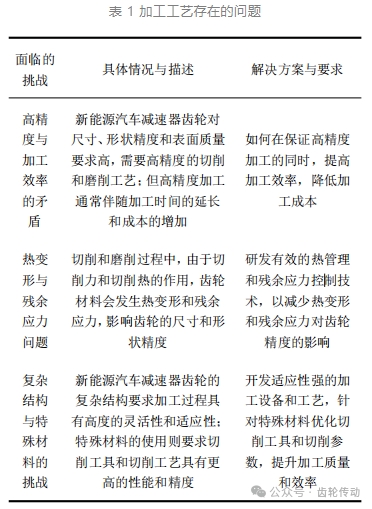 盡管新能源汽車減速器齒輪的加工工藝已經(jīng)取得了顯著的進步,但在實際生產過程中仍存在一些問題和挑戰(zhàn)。高精度加工要求與加工效率之間的矛盾是亟待解決的問題。新能源汽車減速器齒輪對尺寸精度、形狀精度和表面質量的要求極高,這要求加工過程中必須采用高精度的切削和磨削工藝。然而高精度加工往往意味著加工時間的延長和加工成本的增加,如何在保證加工精度的同時提高加工效率是當前加工工藝面臨的重要挑戰(zhàn)。加工過程中的熱變形和殘余應力問題也是影響齒輪加工質量的關鍵因素。在切削和磨削過程中由于切削力和切削熱的作用齒輪材料會發(fā)生熱變形和殘余應力,導致齒輪的尺寸精度和形狀精度發(fā)生變化。因此如何有效控制加工過程中的熱變形和殘余應力是提升齒輪加工質量的關鍵所在。此外新能源汽車減速器齒輪的復雜結構和特殊材料也給加工工藝帶來了難度。齒輪的復雜結構要求加工過程中必須具備高度的靈活性和適應性;而特殊材料的使用則要求切削工具和切削工藝必須具備更高的性能和精度。這些都對加工工藝的創(chuàng)新和優(yōu)化提出了更高的要求。加工工藝存在的問題如表 1 所示: