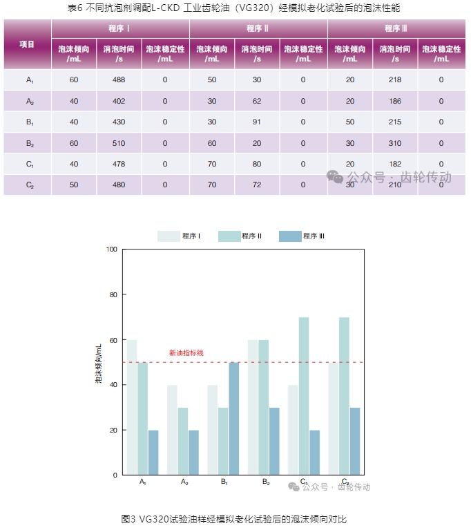 由表 6、圖 3 可以看出,加入 A2 或 B1 時(shí),老化后油品泡沫性能優(yōu)異,仍然滿足 GB 5903《工業(yè)閉式齒輪油》的新油指標(biāo)要求 [程序 I:≤ 50/50(mL/mL);程序 II:≤ 50/50(mL/mL);程序 III:≤ 50/50(mL/mL)]。