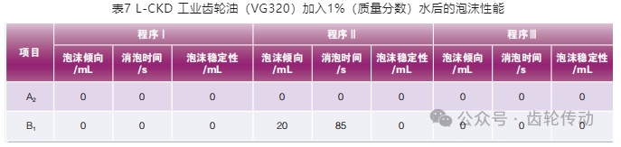 使用 L-CKD 工業(yè)齒輪油(VG320)的大型設(shè)備,其運(yùn)行工況相對(duì)嚴(yán)苛,齒輪箱難以避免污染物的侵入。在以A2、B1調(diào)配的L-CKD工業(yè)齒輪油(VG320)中分別加入 1%(質(zhì)量分?jǐn)?shù))的水,并進(jìn)行泡沫性試驗(yàn),考察抗泡劑在水存在環(huán)境下的性能表現(xiàn),結(jié)果見表 7。
