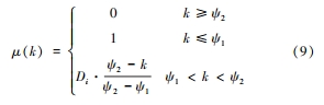 式(9)中,μ(k)表示的是齒輪內部失效模糊漸變區隸屬度數值,k 表示的是模糊數;ψ1 與 ψ2 表示的是模糊上界與下界。