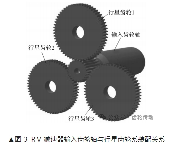 RV 減速器輸入齒輪軸是外部驅(qū)動(dòng)電機(jī)與行星輪關(guān)聯(lián)傳動(dòng)的重要零部件,輸入齒輪軸的傳動(dòng)特性對(duì)整機(jī)性能有較大影響,而且齒輪疲勞斷裂失效及齒面磨損在整個(gè)傳動(dòng)過程中存在,分析輸入齒輪軸在實(shí)際嚙合狀態(tài)下的模態(tài)特性,并進(jìn)行優(yōu)化,對(duì)提高 RV 減速器整體傳動(dòng)性能至關(guān)重要。RV 減速器輸入齒輪軸和行星齒輪系裝配關(guān)系如圖 3 所示。