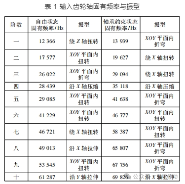 分別對(duì)自由狀態(tài)及軸承約束狀態(tài)下輸入齒輪軸的模態(tài)特性進(jìn)行分析,兩種狀態(tài)下輸入齒輪軸前十階固有頻率及振型見表 1。