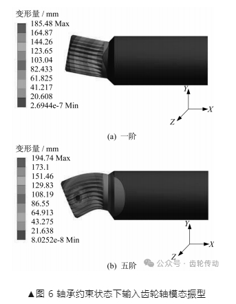 由表 1 可以看出,自由狀態(tài)下輸入齒輪軸的固有頻率低于軸承約束下輸入齒輪軸的固有頻率,且靠近輸入齒輪軸頭部的振型變化較為明顯。自由狀態(tài)下輸入齒輪軸一階和五階模態(tài)振型如圖 5 所示,軸承約束狀態(tài)下輸入齒輪軸一階和五階模態(tài)振型如圖 6 所示。