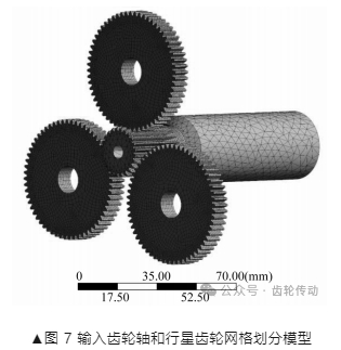 綜合考慮結(jié)構(gòu)規(guī)模及計(jì)算精度,定義輸入齒輪軸網(wǎng)格尺寸為1.5mm,行星齒輪網(wǎng)格尺寸為1mm,整個(gè)模型網(wǎng)格劃分后,節(jié)點(diǎn)總數(shù)為 201 779,單元數(shù)為 61 060。輸入齒輪軸和行星齒輪網(wǎng)格劃分模型如圖 7 所示。
