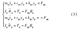 式中:mp 、mg 為主、從動(dòng)輪質(zhì)量,Ip 、Ig 為主、從動(dòng)輪轉(zhuǎn)動(dòng)慣量,kpy、kgy分別為主從動(dòng)輪支撐剛度,cpy、cgy分別為主從動(dòng)輪支撐阻尼。