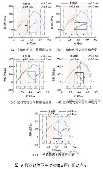 當(dāng)故障齒與主動(dòng)輪輪齒 3 相嚙合時(shí),提取圖 5b 中主動(dòng)輪輪齒 1 至輪齒 5 嚙合區(qū)齒根動(dòng)應(yīng)變?nèi)鐖D 9 所示。可以看出隨著嚙合過程的進(jìn)行,作用于從動(dòng)輪故障齒上的載荷有所降低,使得在整個(gè)嚙合區(qū)內(nèi),主動(dòng)輪輪齒 3 的齒根應(yīng)變與無故障條件下相比呈降低趨勢(shì),但在嚙合力沖擊的作用下其降幅較小。除輪齒 3 外,其余輪齒齒根應(yīng)變的變化趨勢(shì)與從動(dòng)輪對(duì)應(yīng)輪齒相似。當(dāng)主動(dòng)輪輪齒處于第二個(gè)三齒或雙齒嚙合區(qū)間時(shí),其載荷作用點(diǎn)接近齒頂,力臂較大,在相同載荷增量作用下其齒根應(yīng)變?cè)龇^大,因此主動(dòng)輪輪齒 4 及輪齒 5 的齒根應(yīng)變?cè)龇源笥趶膭?dòng)輪相應(yīng)輪齒。類似地,輪齒 1 及輪齒 2 的齒根應(yīng)變?cè)龇孕∮趶膭?dòng)輪對(duì)應(yīng)輪齒。