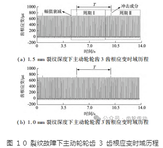 由于從動(dòng)輪發(fā)生裂紋故障后主動(dòng)輪各輪齒齒根應(yīng)變時(shí)域歷程基本一致,此處以圖 5b 中主動(dòng)輪輪齒 3 為例,分別提取 1.0 mm 及 1.5 mm 裂紋深度下該輪齒齒根應(yīng)變時(shí)域歷程如圖 10 所示。可以看到當(dāng)從動(dòng)輪故障齒分別與圖 5b 中主動(dòng)輪輪齒 4 及輪齒 3 相嚙合時(shí),由圖 9 可知此時(shí)主動(dòng)輪輪齒 3 齒根應(yīng)變峰值將出現(xiàn)不同程度的增大或減小,導(dǎo)致齒根應(yīng)變出現(xiàn)周期性沖擊及幅值衰減,且隨著裂紋深度的增加,上述現(xiàn)象愈明顯。其中周期 T 表達(dá)式為: