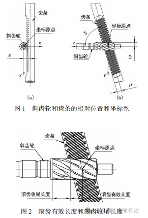 在某些機(jī)械產(chǎn)品(如轉(zhuǎn)向器) 中,通常使用斜齒輪和(圓柱型)齒條配合實(shí)現(xiàn)旋轉(zhuǎn)運(yùn)動(dòng)和直線運(yùn)動(dòng)的轉(zhuǎn)換,在這些產(chǎn)品中,斜齒輪經(jīng)常有一端沒(méi)有被“滾通”,即存在著一段滾齒加工的收尾長(zhǎng)度。在收尾長(zhǎng)度里,若不是正常的齒形則不能參與齒條的嚙合運(yùn)動(dòng),因此要避開(kāi)齒條,即斜齒輪的滾齒有效長(zhǎng)度要足夠長(zhǎng),否則會(huì)與齒條產(chǎn)生干涉進(jìn)而影響機(jī)械產(chǎn)品的性能。另外,知道了斜齒輪的滾齒有效長(zhǎng)度,還可以設(shè)計(jì)斜齒輪的齒部在原點(diǎn)的另一端,即將其設(shè)置在滾通的那一端的端面的合適的位置。另一方面,斜齒輪的收尾長(zhǎng)度也影響著斜齒輪相關(guān)的機(jī)械產(chǎn)品的尺寸和受力等。劉法權(quán)基于 BASIC 語(yǔ)言編程,用數(shù)值的方法計(jì)算了滾齒時(shí)刀架回轉(zhuǎn)中心至滾刀頂圓柱與毛坯頂圓柱交線最低點(diǎn)的距離,這段距離就等于收尾長(zhǎng)度。劉忠朝給出了一些切入長(zhǎng)度(收尾長(zhǎng)度)的簡(jiǎn)化或近似計(jì)算式的誤差比較,但是斜齒輪的滾齒收尾長(zhǎng)度的精確解析表達(dá)式還沒(méi)有文獻(xiàn)提到過(guò),與齒條配合的斜齒輪需要的滾齒有效長(zhǎng)度也沒(méi)有文獻(xiàn)涉及過(guò)。基于此,筆者重點(diǎn)研究斜齒輪的有效長(zhǎng)度和收尾長(zhǎng)度的計(jì)算,推導(dǎo)得到了這兩個(gè)解析表達(dá)式,并通過(guò) SolidWorks軟件驗(yàn)證了其正確性,該計(jì)算求解對(duì)與斜齒輪相關(guān)的機(jī)械產(chǎn)品的設(shè)計(jì)有重要意義。