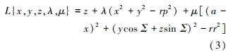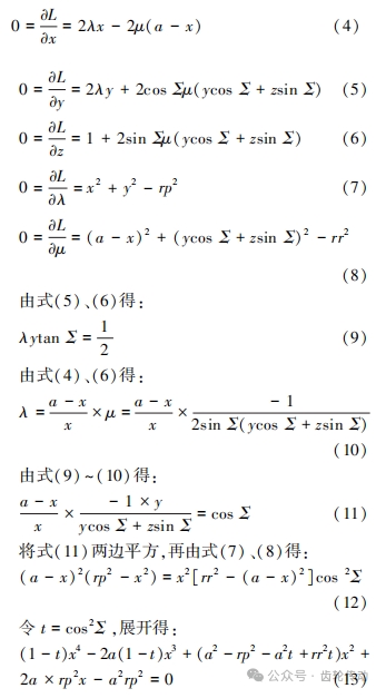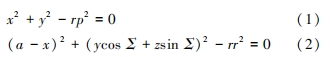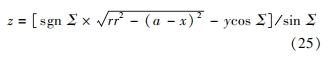 用數(shù)學(xué)語(yǔ)言描述,就是在式(1)和式(2)的條件下求 z 的極值,其中式(1)表示點(diǎn){x,y,z}在斜齒輪齒頂圓柱的表面,而式(2)表示點(diǎn){ x,y,z}在齒條圓柱的表面。