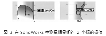 下面給出一個(gè)算例,如果中心距 a = 17.95 mm、軸交角 Σ = 74° 55′、斜齒輪齒頂圓半徑 rp = 11. 175 mm、齒條半徑 rr = 13.5 mm,則按照上述公式計(jì)算得到 z 的極值是 12.692 9 mm。另一方面也可以在一些三維建模軟件(如 SolidWorks )中進(jìn)行驗(yàn)證,先創(chuàng)建斜齒輪齒頂圓柱的三維模型,再按照正確的中心距和軸交角創(chuàng)建齒條圓柱的三維模型,并用齒條圓柱“切除”斜齒輪齒頂圓柱,得到兩個(gè)圓柱的相貫線。在 SolidWorks 中測(cè)量相貫線的 z 坐標(biāo)的極值,同樣是 12.692 9 mm,如圖 3 所示,從而驗(yàn)證了上述公式的正確性。