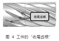 現(xiàn)在考慮斜齒輪的滾齒收尾長(zhǎng)度。按文獻(xiàn),滾刀和工件實(shí)質(zhì)上可以看作是兩個(gè)交錯(cuò)軸的斜齒輪的嚙合,且滾刀和工件是點(diǎn)接觸的。滾齒加工斜齒輪時(shí),滾刀和工件按一定的速比繞各自軸線旋轉(zhuǎn),即展成運(yùn)動(dòng)。另外,滾刀還沿工件軸線方向平移,工件再附加一個(gè)轉(zhuǎn)動(dòng),即進(jìn)給運(yùn)動(dòng)。展成運(yùn)動(dòng)過(guò)程中,在工件上形成了一條接觸點(diǎn)軌跡,在進(jìn)給運(yùn)動(dòng)過(guò)程中,這條接觸點(diǎn)軌跡通過(guò)螺旋掃描得到了被加工的齒面。當(dāng)進(jìn)給運(yùn)動(dòng)結(jié)束后開(kāi)始退刀,即滾刀軸線和工件軸線的中心距開(kāi)始增大,同時(shí)展成運(yùn)動(dòng)仍然在進(jìn)行。于是就在工件上留下一段收尾的不正常齒形,工件的“收尾齒根”如圖 4 所示。
