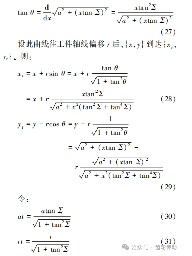 因?yàn)闈L刀退刀時(shí)。滾刀和工件都仍然繞其軸線旋轉(zhuǎn),所以考慮滾刀軸線按照滾齒中心距 a 和滾齒軸交角 Σ 繞工件軸線旋轉(zhuǎn)得到一個(gè)旋轉(zhuǎn)幾何體。在過(guò)工件軸線的平面內(nèi)截得的曲線是:
