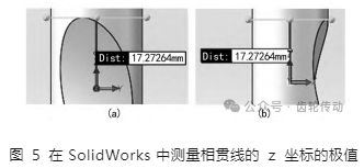 然后可以在一些三維建模軟件(如SolidWorks) 中進(jìn)行驗(yàn)證,先創(chuàng)建斜齒輪齒頂圓柱的三維模型,再按照正確的滾齒中心距和滾齒軸交角創(chuàng)建滾刀外圓柱的三維模型,用滾刀外圓柱“切除”斜齒輪齒頂圓柱,得到兩個(gè)圓柱的相貫線。在軟件中測(cè)量相貫線的 z 坐標(biāo)的極值如圖 5 所示,同樣是 17.272 64 mm,從而驗(yàn)證了上述公式的正確性。