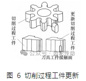 步驟 3:切削過程工件更新。如圖 6 所示,通過待加工齒廓數學模型構造工件幾何實體模型,將生成的刀具掃掠體和切削過程工件進行布爾求差,得到更新后的切削過程工件;