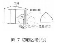 步驟 4:切觸區域識別。如圖 6 和圖 7 所示,刀具掃掠體與切削過程工件相交,將會在更新的過程工件中產生一些列接觸面;切觸區域位于接觸面內,同時切觸區域也是部分刀具回轉面;當采用球頭銑刀進行精加工時,僅有球頭部分進行切削,因此切觸區域為球面的一部分;根據這一特點,從更新后的切削過程工件中,圓心位于刀位點處 CLk,i具有球面幾何特性的面即為切觸區域;