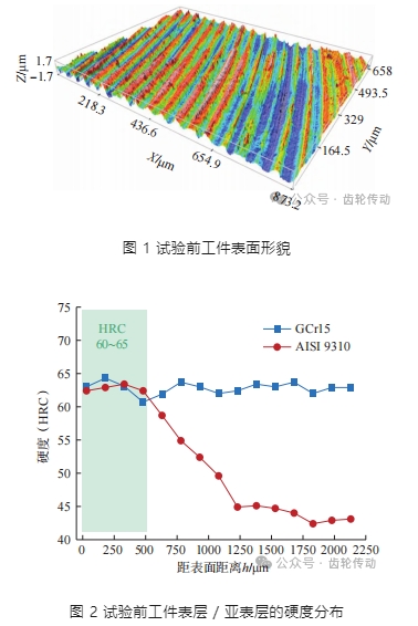 試驗所用工件材料為滲碳淬火齒輪鋼 AISI 9310 和淬火軸承鋼 GCr15,其化學成分如表 1 所示。通過電火花線切割加工(WEDM)制備尺寸為 30 mm×10 mm×12 mm 的工件。其中,10 mm 為砂輪寬度方向,30 mm 為工件進給方向,12 mm 為磨削深度方向,30 mm×10 mm 即為平面磨削試驗表面,且在試驗前通過銑削將該表面粗糙度降低至 Ra0.8 μm,如圖 1 所示。圖 2 為試驗前工件表層 / 亞表層的硬度分布,在距表層 500 μm 的深度內, 兩種鋼材料熱處理后的硬度能夠達到 HRC60~65。