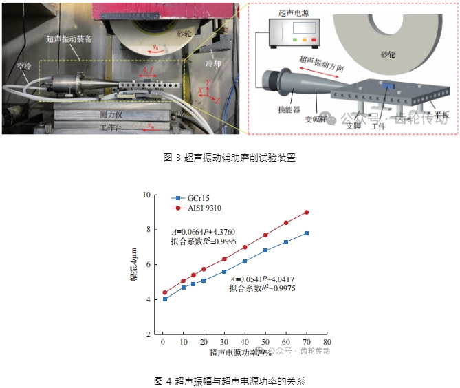 試驗裝置如圖 3 所示。磨削試驗采用 BLOHM Profit MT–408 高速精密平面成形磨床,其最大輸出功率為 45 kW,最大轉速為 8000 r/min,并配有冷卻系統。砂輪采用已廣泛用于磨削淬火鋼的白剛玉砂輪,牌號為 WA80F6V35M,其最大線速度為 35 m/s,磨粒粒度為 80#,外徑為 400 mm,寬度為 20 mm。工件通過螺栓固定于自研的超聲振動平臺上,將該平臺連接至超聲電源并設置頻率為平臺的諧振頻率 19.6 kHz,以產生平行于工作臺進給方向的高頻振動。此外,在調節超聲電源功率的同時,利用單點激光測振儀 LV–S01 測量工件的振幅,如圖 4 所示,兩種材料的實際振幅與超聲電源輸出功率呈現良好的線性關系,在試驗中通過控制超聲電源功率使振幅為 6 μm。此外,磨削環境非常復雜,磨削過程中工件周圍被冷卻液覆蓋,導致無法采集到磨削過程中的動態振幅信號,所以本研究中采用了無磨削熱力負載條件下的振幅值。