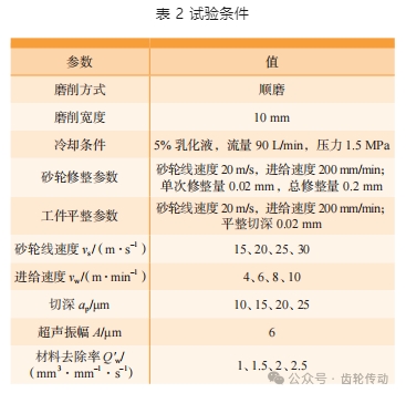 為探究齒輪鋼 AISI 9310 淬硬表面超聲振動輔助磨削加工性,設計以磨削 3 要素為變量的單因素對比試驗,即砂輪線速度 vs、進給速度 vw 和切深 ap。所有試驗均采用順磨的方式,在試驗過程中,交替關閉和開啟超聲電源以實現普通磨削和切向超聲磨削。每組試驗前,使用相同的磨削參數對工件進行平整,并使用單點金剛石筆對白剛玉砂輪進行修整,以確保試驗條件的一致性。具體的試驗條件如表 2 所示。