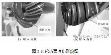 大功率試驗主要是通過試驗器加載考核該中間減速器在最大功率 650kW 下齒輪是否嚙合正常,試驗功率 650kW、時間 10min,試驗后分解檢查,要求各零件外觀應無異常磨損現象。該中間減速器在完成大功率試驗后分解檢查,發現輸入齒輪、輸出齒輪的各齒工作面均存在不同程度擦傷問題,輸入齒輪齒面擦傷位于齒根處,輸出齒輪齒面擦傷位于靠齒頂處。擦傷形貌為:輸入齒輪齒面上 除了接觸印痕之外,在接觸印痕下方有一條亮帶;輸出齒輪凸面靠近齒頂位置磨亮。中減輸入、輸出齒輪擦傷區域長約 5mm,寬約 2mm,深約 0.01mm,中減輸出齒輪工作面(凸面)齒頂印痕已超出齒頂,中減輸入齒輪工作面(凹面)齒頂印痕未超出齒頂。擦傷形貌(如圖 2 所示)。