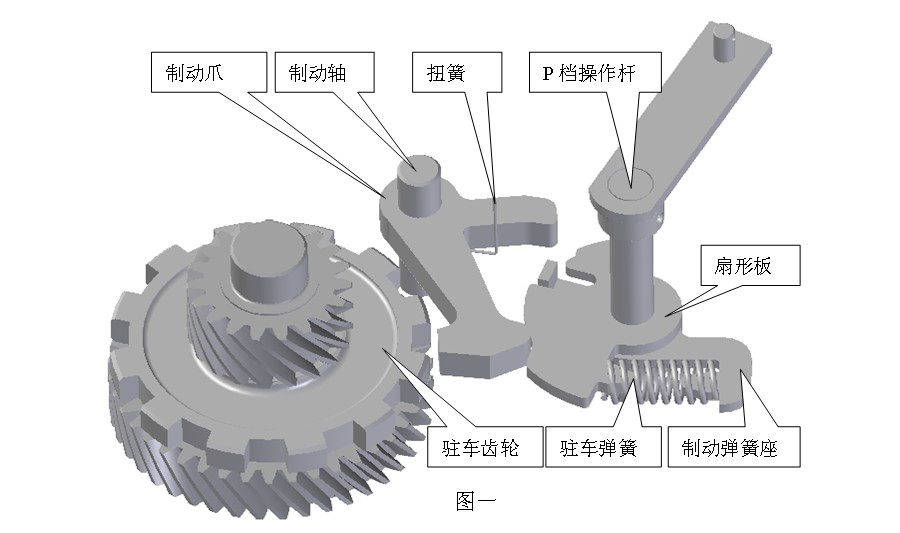 此結構包括:制動爪,制動軸、扭簧、P檔操作桿、扇形板、制動彈簧座、駐車彈簧、駐車齒輪,如下圖一;制動彈簧座與P檔操作桿固定在一起運動,扇形板與P檔操作桿能相對運動,扇形板安裝在制動彈簧座上,一端通過彈簧預緊,有一定的預緊力,另一端被制動彈簧座的凸臺限位住。當P檔操作桿轉動時,帶動制動彈簧座一起轉動,制動彈簧座通過彈簧推動扇形板,當扇形板阻力大于制動彈簧座的推力時一起轉動,當扇形板阻力大于制動彈簧座的推力時,壓縮彈簧。制動爪可以在制動軸上自由轉動,扭簧一端固定在制動爪上,一端固定在箱體上,并且有一定的預緊力。扇形板上有一個爬坡斜面用于推動制動爪,制動爪被扇形板推動實現運動轉動,通過扭簧預緊力實現回位。依靠扭簧與彈簧間力的差值實現駐車制動和退出駐車制動,即:在駐車時,彈簧的彈力大于扭簧的回位力,在退出駐車后,扭簧的回位力實現退出駐車制動。制動齒輪安裝固定在變速器的一個齒輪軸上。