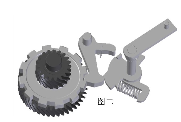 理想狀況下,制動爪在扭簧的作用下遠離駐車齒輪,當置于P檔時,由傳動箱外部P檔操縱桿帶動止動軸轉動一角度,壓縮駐車彈簧推動扇形板轉動(駐車彈簧的壓力要比扭簧的扭力大的多),使得止動爪沿扇形面向下轉動,從而進入駐車齒輪的齒槽內,阻止傳動箱內部齒軸件的轉動,達到駐車止動的目的(如圖二)。