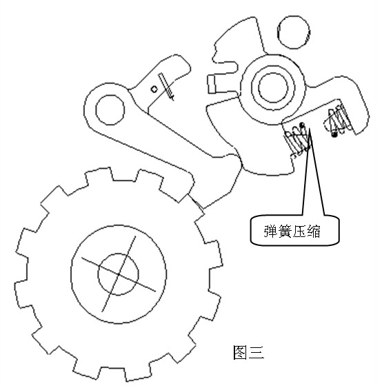 在多數情況下,止動爪的爪部落在駐車齒輪的齒頂上(如下圖三),雖然止動軸轉動,但因止動爪不能進入駐車齒輪的齒槽而阻止扇形板不能轉動,駐車彈簧被壓縮,止動爪被緊緊地壓在駐車齒輪的齒頂上,此時扇形板在彈簧的壓力下仍有轉動的趨勢,只要車輛有移動,引起駐車齒輪轉動,止動爪的爪部就能進入駐車齒輪的齒槽內,實現駐車制動。