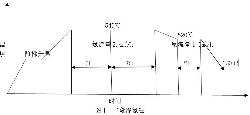 我廠采用負(fù)低壓真空滲氮處理,通過控制氨氣滴注量來調(diào)節(jié)氨氣的分解率。其中氨氣采用循環(huán)滴注,產(chǎn)品的裝夾方式為平放,先低溫入爐預(yù)氧化一段時間,隨后階梯升溫至滲氮溫度,具體工藝見圖1所示。