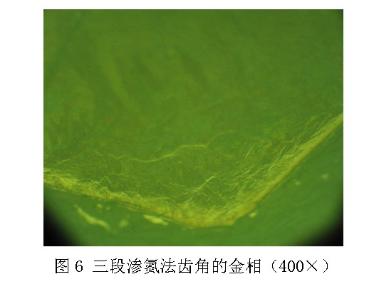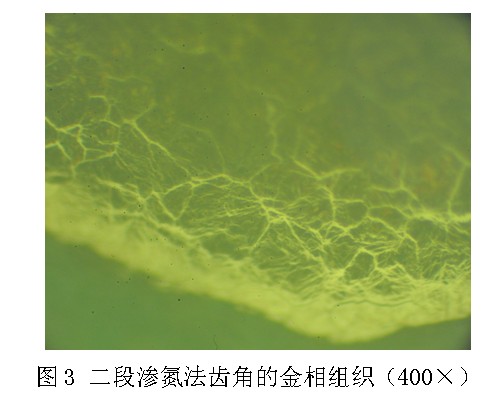 對產(chǎn)品進(jìn)行理化檢驗(yàn),其表面硬度為1110-1130HV。用制樣機(jī)將錐齒輪的齒角處制成金相試樣,采用4%的硝酸酒精溶液腐蝕,在金相顯微鏡下觀察組織,見圖3。進(jìn)過檢驗(yàn),產(chǎn)品氮化層深為0.37mm,化合物層深0.012mm。