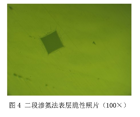 采取之前同樣的方式對產(chǎn)品進(jìn)行了理化檢驗(yàn),其中表面硬度為950-950HV,滲氮層深為0.27mm,化合物層0.008mm。圖6為該工藝下錐齒輪齒角部位的金相組織。由圖可見,相對于圖3,化合物層較致密,表層有少量細(xì)點(diǎn)狀空隙,齒輪疏松評定為2級。擴(kuò)散層中存在少量呈脈沖狀分布的氮化物,氮化物評定為2級。圖7為表面脆性照片,可見,在四方形的一邊出現(xiàn)了很少量的裂紋,故脆性評定為2級。由此可見,氮化后的技術(shù)指標(biāo)完全符合產(chǎn)品的技術(shù)要求。