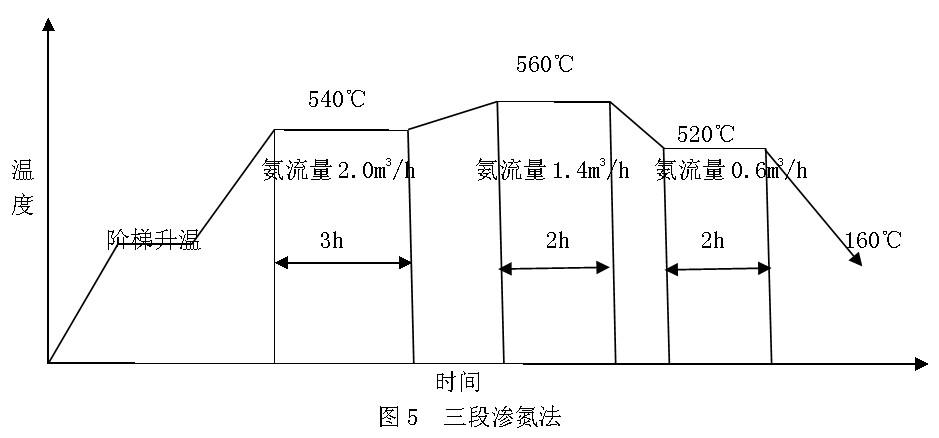隨后對產(chǎn)品滲氮工藝進(jìn)行了改進(jìn),采用三段滲氮法。同時為了有效地控制氨氣水分含量,采用新干燥劑來干燥通入氮化爐中的氨氣,并確保氮化爐未出現(xiàn)爐內(nèi)漏氣等設(shè)備的影響。產(chǎn)品的具體工藝見圖5。