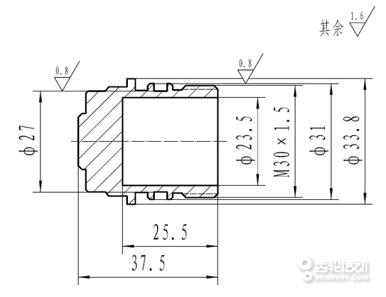 粗加工選擇低轉速大進給量,切削參數選擇:切削深度ap=0.8~1.2 mm;進給量F=0.18~0.4 mm/n;主軸轉速S=600~1000rpm。粗車刀片一個刀刃可加工25~30件零件。精加工及鏜孔加工切削參數選擇:切削深度ap=0.2mm;進給量F=0.1mm/n;主軸轉速S=2000rpm左右,精車刀片一個刀刃可加工45~50件零件,鏜孔加工時一個刀刃可加工35~45件,加工后零件的表面粗糙度可達Ra0.8,尺寸精度可控制0.005mm以內,滿足了零件的設計要求,而且車削零件時的加工硬化現象基本消除,大大提高了加工效率及刀具使用壽命。