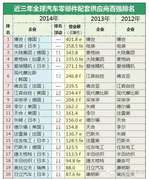 美國汽車雜志《AutomotiveNews》每年都會發布一份汽車供應商百強名單,排名是根據各企業零部件配套業務的營收統計而來(非配套業務被剔除在外)。目前最新的一份榜單是基于2013年的財務數據,在這份榜單中上榜的都是叱咤全球汽車產業的“幕后英雄”,從2012年開始,博世連續三年位居這份榜單的首位。下圖是汽車零部件供應商百強幫當中前二十位企業近三年的排名。