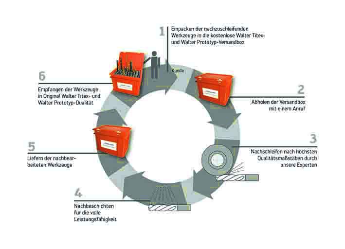 對于瓦爾特集團(tuán)來說,并不是產(chǎn)品賣出去后就了事,從某種意義來說,這僅僅是開始:“我們產(chǎn)品壽命周期的第二步是翻新服務(wù),”瓦爾特集團(tuán)翻新服務(wù)和回收經(jīng)理延斯·彼得·施那克(Jens-Peter Schneck)說。“我們的客戶已經(jīng)將其刀具送到我們的翻新服務(wù)中心進(jìn)行過3~5次重磨和重涂。在14天之內(nèi),我們開始對磨損刀具進(jìn)行重磨和重涂,并返還給客戶。重磨和重涂后,刀具恢復(fù)如新。對我們來說,翻新服務(wù)在延長產(chǎn)品壽命周期,節(jié)省成本和資源方面起著關(guān)鍵作用。如果刀具全部磨損,我們將按每千克的價值購回有用的硬質(zhì)合金,并安排從客戶工廠運走。然后,在我們自己的回收工廠按零部件拆解,其中經(jīng)過處理提取純碳化鎢,用于新刀具的生產(chǎn)。這就是全封閉產(chǎn)品循環(huán)的形成過程,”施那克對整個概念加以總結(jié)。