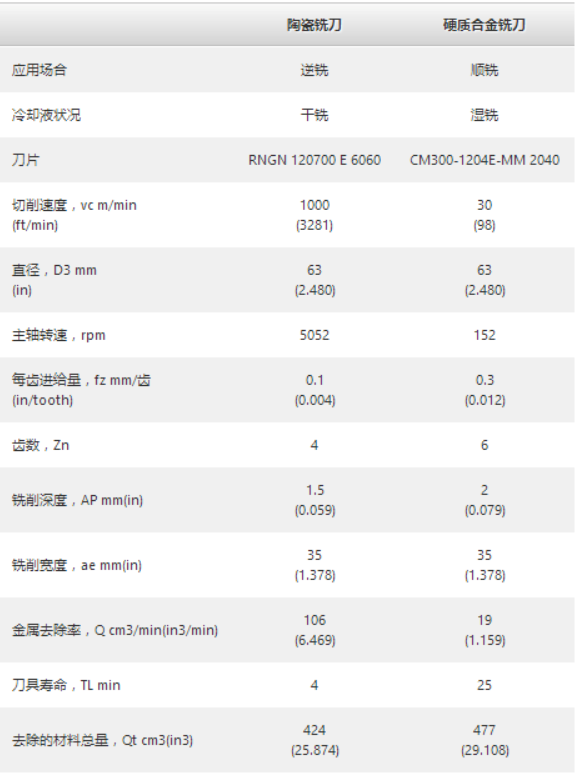為了在此類應用中獲得成功,需要對切削工藝進行精心規劃。與采用硬質合金銑刀的常規方法不同,陶瓷面銑刀的切削速度可達 1000m/min,比硬質合金銑刀的金屬切除率高 5 倍以上。