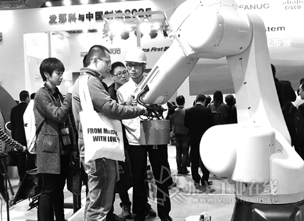 在發布會上,發那科還推出2016年最新款CR-7iA小型人機協作機器人,手腕部最大負載7kg,動作可達半徑717mm。記者在展臺上看到,該款機器人在操作時,無需使用安全柵欄、人與機器人可共享某個區域進行作業;人與機器人可相互協調地進行重零件的搬運、零件的裝配等各種作業。